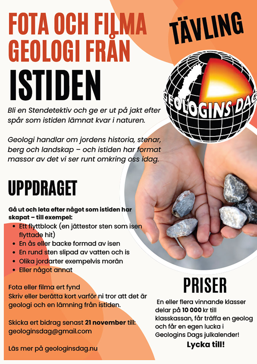 Alla klasser från förskolan till gymnasiet samt folkhögskolan är välkomna att delta i vår film- och fototävling. Låt eleverna upptäcka geologi genom att fånga den med kameran och på så sätt få chansen att vinna priser!